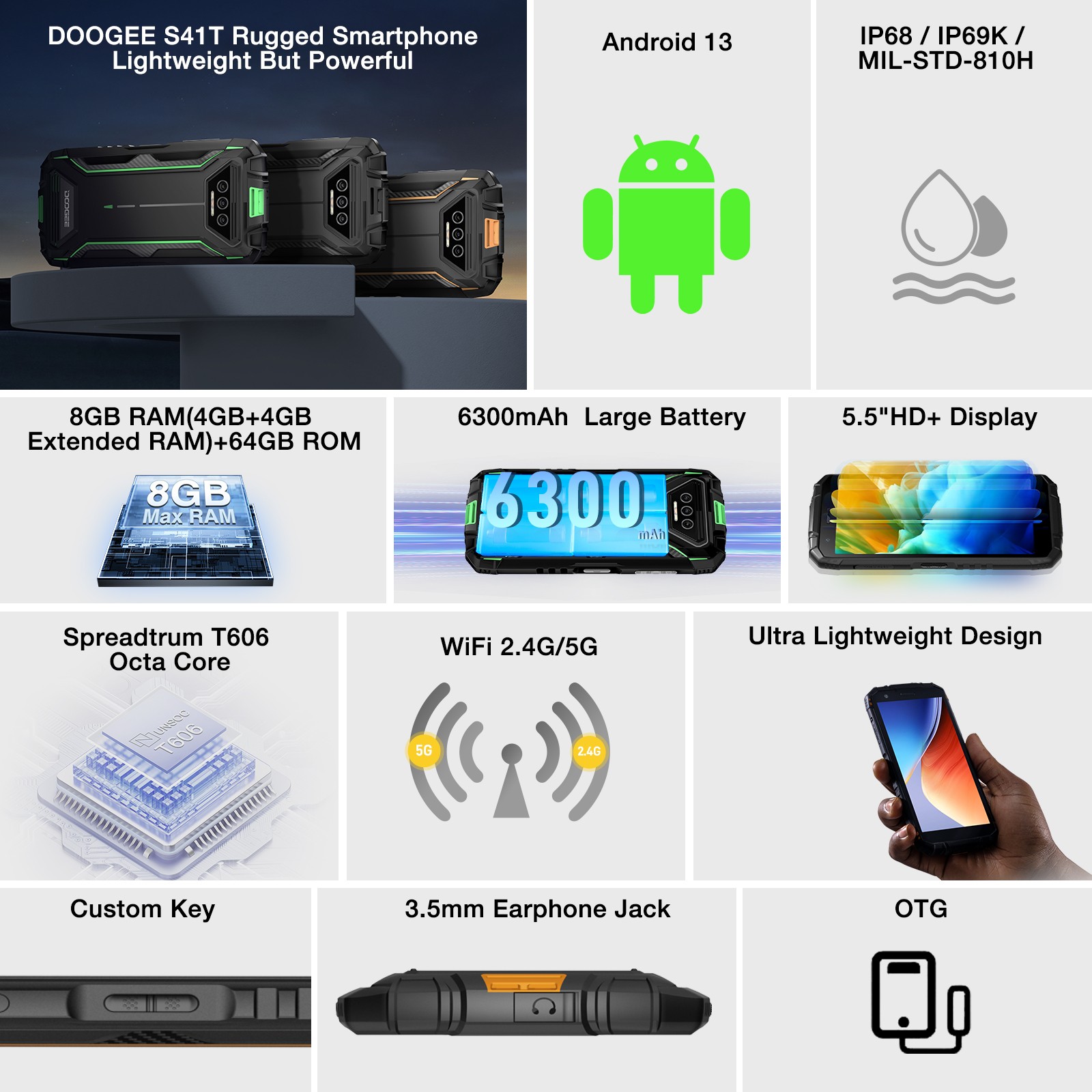 DOOGEE S41T Outdoor Handy Ohne Vertrag Android 13 Smartphone 6300mAh 8GB+64GB DE